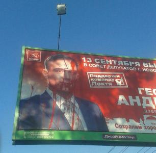 В ночь с 9 на 10 сентября неизвестные облили краской баннер кандидата в Совет депутатов Георгия Андреева на улице Бориса Богаткова.