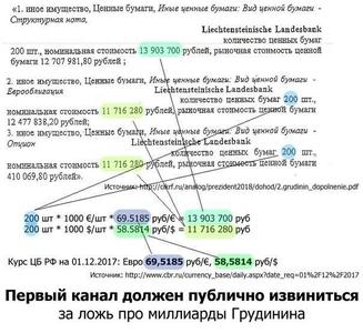 Можете сами всё взять и пересчитать, умножив акции на стоимость евро и доллара по курсу ЦБ 69,5 рублей за евро и 58,5 рублей за доллар, и получите следующие суммы: 13 900 000 рублей и 11 700 000 рублей соответственно. Как видите, никакими миллиардами у Павла Грудинина совсем не пахнет!