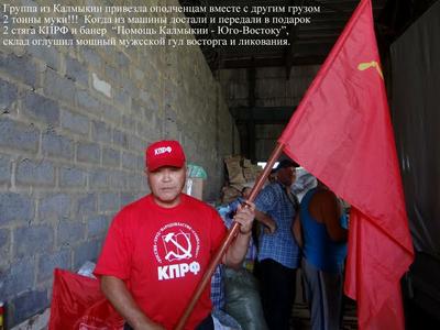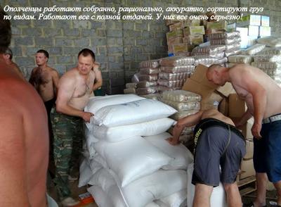 Пока местная граница была закрыта, водители прилегли отдохнуть (у них было 2 — 3 часа). В семь утра тронулись, доехали до международного автомобильного пункта пропуска «Донецк» и стали ждать, когда приедут ополченцы. Они приезжают из Луганска и Донецка на своих машинах, сами разгружают и увозят груз в свои города. Работают молча, слаженно, быстро, как будто берегут каждую минуту. К грузу относятся бережно, аккуратно складывают его по видам. Всплеск эмоций этих мужественных мужчин наблюдала трижды. Бурю восторга у них вызвал 35-килограммовый бочонок меда, который саратовцы выгрузили из «Газели» первым (его передал с личной пасеки житель пос. Романовки Севидов Павел Михайлович). Мощный гул ликования раздался на складе, когда группа из Калмыкии вручила ополченцам 2 стяга КПРФ и баннер «Помощь Калмыкии Юго-Востоку» и, когда в конце разгрузки москвичи подарили им красные футболки с надписью «Народное ополчение».