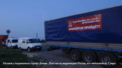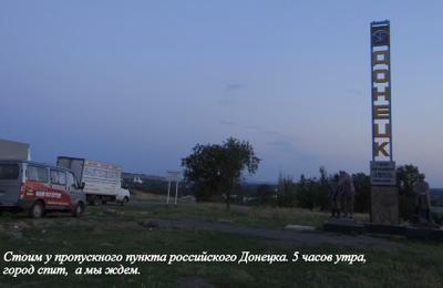 Мы выехали рано утром, заехали в Балашовский райком КПРФ, загрузились и отправились в г. Павловск Воронежской области, где должны были присоединиться к автопоезду ЦК КПРФ. Ждать пришлось около пяти часов, так как фуры угодили в пробку. Собрались все только около десяти часов вечера, старший группы сопровожденияГаписов Ильгам рассказал нам о маршруте и дальнейших действиях. Мы доехали до указателя «Каменск-Шахтинский», резко свернули направо и долго ехали прямо куда-то вглубь. Увидев на указателе «Донецк, 23 км», мы в машине тревожно переглянулись. Донецк? Планировалось же в Ростов-на-Дону? Расстояние быстро сокращалось, и в четыре часа утра наш автопоезд остановился напротив выросшей из темноты стелы с надписью «Донецк». Это был город Ростовской области. Итак, перед нами были два Донецка (мы это увидели только на рассвете): один в низине утопал в зелени и мирно спал, а другой — за пригорком, и с той стороны доносился грохот орудий, шел обстрел Луганска из установок «Град».