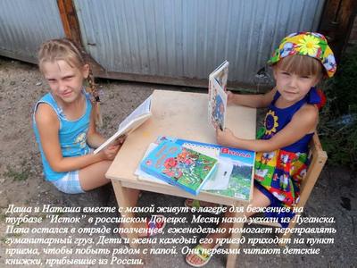 Рядом со складом за маленьким столиком я увидела двух девочек, которые, никому не мешая, сидели и тихо рассматривали детские книжки. Это были Юля и Даша. Вместе с мамой они приехали из Луганска в Донецк месяц назад, как только начался массированный обстрел их родного города. Разместились, как и другие беженцы, на турбазе «Исток». Подошла их мама, Ольга, и согласилась со мной поговорить: