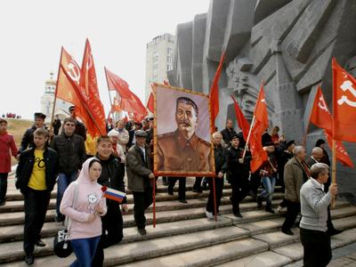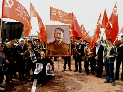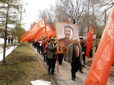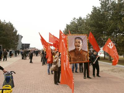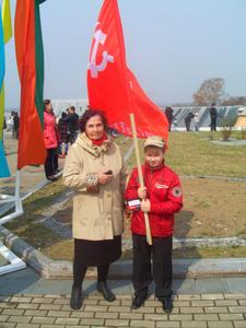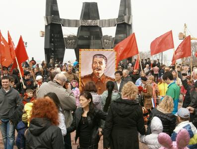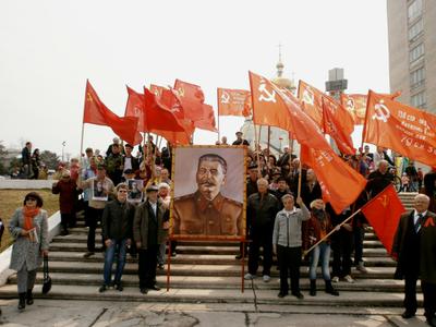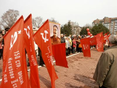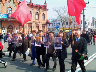 Но на многолюдных улицах не было видно символов Великой Победы – ни Знамени Победы, водруженного над рейхстагом в мае 1945 года, ни государственных флагов СССР, ни портретов Верховного главнокомандующего И.В. Сталина и полководцев Победы… Зато городские власти щедро снабдили хабаровчан картонными триколорами, а над Законодательной Думой был вывешен красный флаг со звездой, но без серпа и молота. И лишь после того, как на площади появилась краснознаменная колонна коммунистов во главе с портретом Генералиссимуса И.В. Сталина, жители Хабаровска наконец-то смогли почувствовать, что в город пришел День Победы!