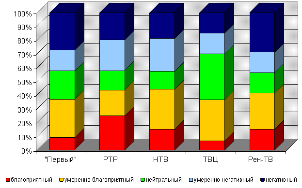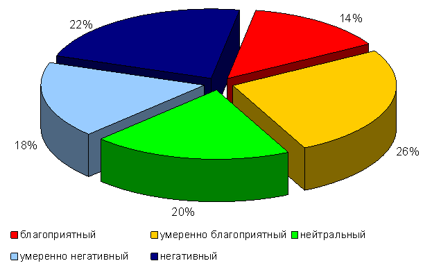 Пятая часть эфира имеет нейтральный характер. Доли позитивной и негативной составляющей равны (по 40%). Однако в позитивном информационном фоне преобладает умеренно-благоприятная составляющая (26 против 14%), а в негативном – резко неблагоприятная (22 против 18%).