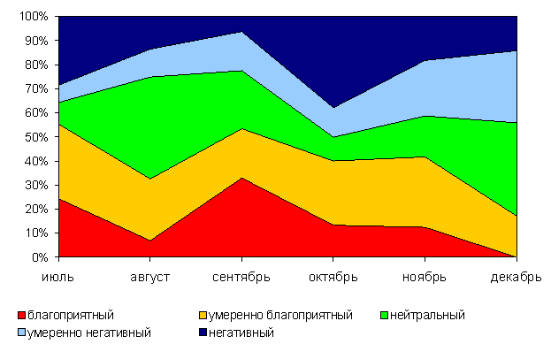 Как видно из графика, структура информационного фона в течение II полугодия 2008 года имела тенденцию, во-первых, к нейтрализации, и во-вторых, к повышению негативной составляющей.