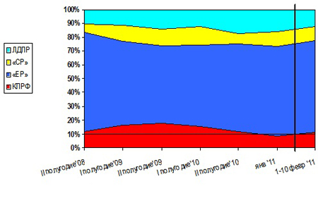 Динамика суммарного партийного эфира, июль 2008 г. – 10 февраля 2011 г.