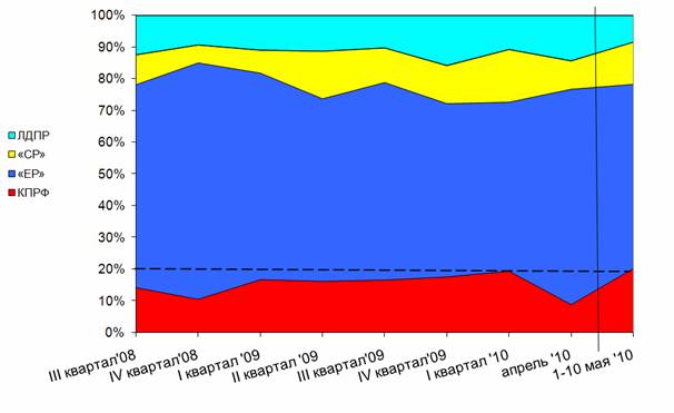 Таким образом, в начале мая доля КПРФ возросла до 20%, что было связано с проводимыми Коммунистической партией Первомайскими торжествами.