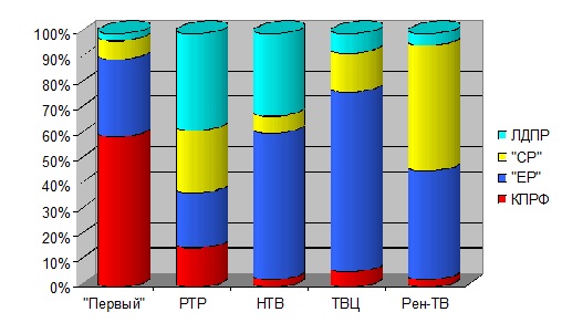 «Единой России» была предоставлена наибольшая доля телеэфира на ТВЦ и НТВ (70 и 59%). На «Первом» канале эта величина опустилась до 30%. «Справедливая Россия» заняла максимум эфира телеканала Рен-ТВ (44%). ЛДПР отдали предпочтение «Россия» и НТВ (31 и 23%).