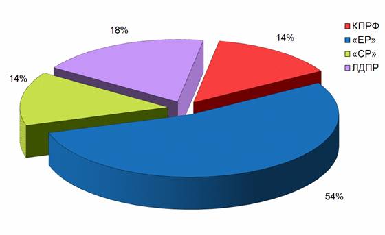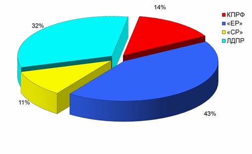 «Единая Россия» получила 1 час 6 минут 24 секунды, что составило 43%. На долю ЛДПР пришлось 32% эфирного времени, «Справедливую Россию» показывали 11% от суммарной продолжительности политических телепередач.