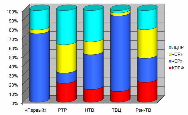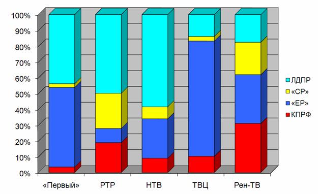 «Единой России» была предоставлена наибольшая доля телеэфира на ТВЦ и «Первом» (73 и 50%). Однако нигде эта величина не опускалась ниже 9%. «Справедливая Россия» заняла максимум эфира телеканалов «Россия» и Рен-ТВ (22 и 20%). ЛДПР отдали предпочтение НТВ и «Россия» (58 и 50%).