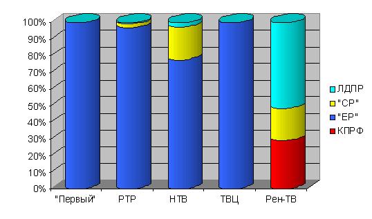 Максимальную долю эфирного времени получила КПРФ на Рен-ТВ (12%). «Первый» канал, «Россия» и НТВ Компартию проигнорировали.