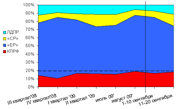 Динамика суммарного партийного эфира, 28 апреля 2008 г. – 20 сентября 2009 г.