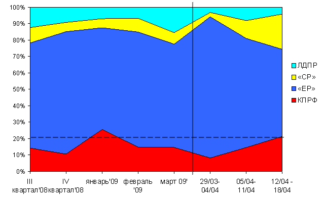 Динамика суммарного партийного эфира, 28 апреля 2008 года – 18 апреля 2009 года