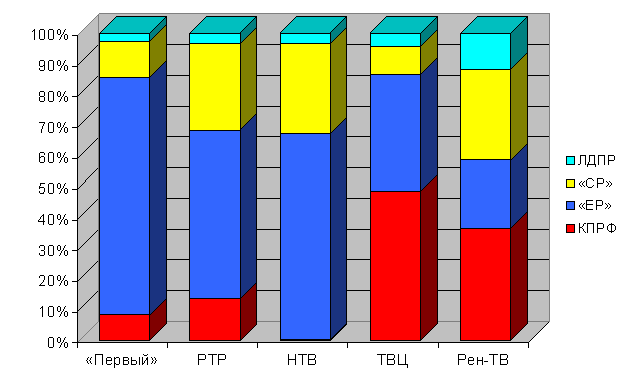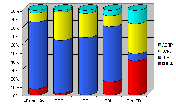 «Единой России» была предоставлена наибольшая доля телеэфира на «Первом» и НТВ (77 и 67%). Однако нигде эта величина не опускалась ниже 22%. «Справедливая Россия» заняла максимум эфира телеканалов НТВ и Рен-ТВ (по 29%). ЛДПР отдал предпочтение Рен-ТВ (12%).