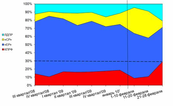 Динамика суммарного партийного эфира, июль 2008 г. – 28 февраля 2010 г.
