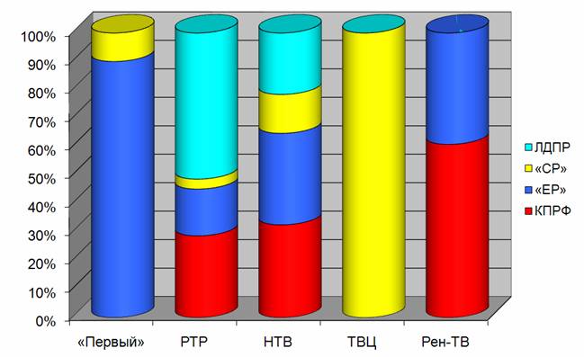 Максимальную долю эфирного времени получила КПРФ на Рен-ТВ и «России» (38 и 33%). «Первый» канал и ТВЦ Компартию проигнорировали.
