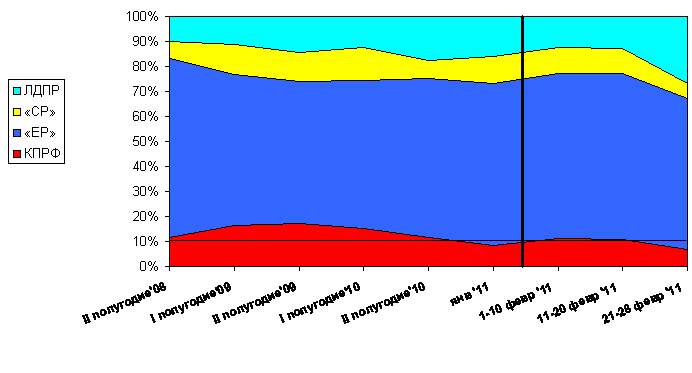 В течение июля 2008 г. – февраля 2011 г. структура партийного телеэфира менялась следующим образом (График 3):