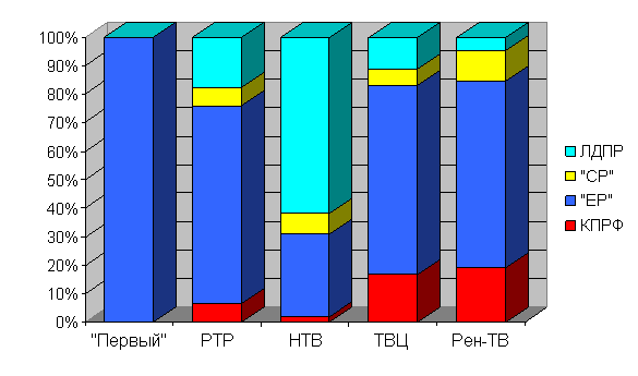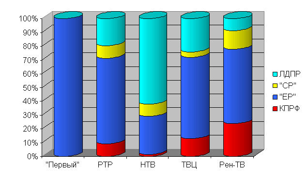 Максимальную долю эфирного времени получила КПРФ на Рен-ТВ и ТВЦ (19 и 17%). «Первый» канал Компартию проигнорировал, НТВ предоставил ей всего 2% эфирного времени.