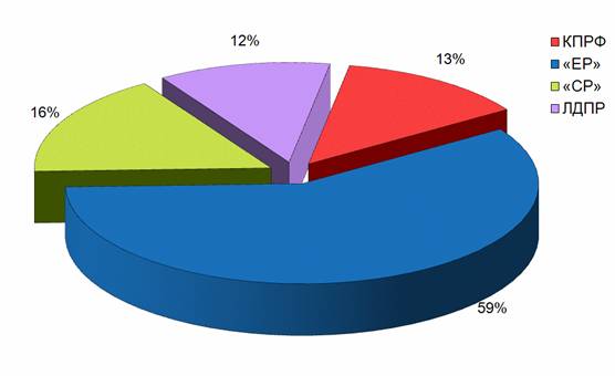Что касается синхрона (прямой речи) партийцев, то его структура аналогична: единороссам было предоставлено 59% суммарного времени, либерал-демократам – 12%, справороссам – 16%. Коммунистам досталось 20 минут 47 секунд, или 13%, что в 4 раза меньше чем представителям «ЕР» и на четверть меньше, чем «СР» (График 2).