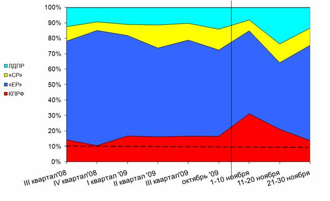 В течение июля 2008 г. – ноября 2009 г. структура партийного телеэфира менялась следующим образом (График 3):