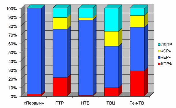 «Единой России» была предоставлена наибольшая доля телеэфира на «Первом» и НТВ (98 и 86%). Однако нигде эта величина не опускалась ниже 47%. «Справедливая Россия» заняла максимум эфира телеканала «Россия» (13%). ЛДПР отдал предпочтение ТВЦ (26%).