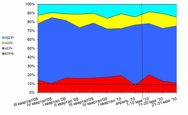 В течение июля 2008 г. – мая 2010 г. структура партийного телеэфира менялась следующим образом (График 3):