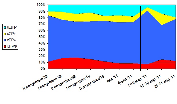 Таким образом, в конце марта доля КПРФ упала на 2% по сравнению с предыдущей декадой. Доля «ЕР» одновременно возросла на 12%.