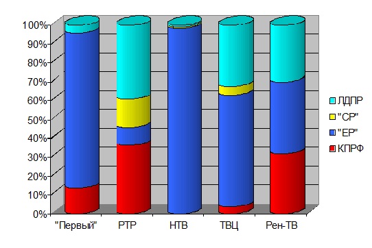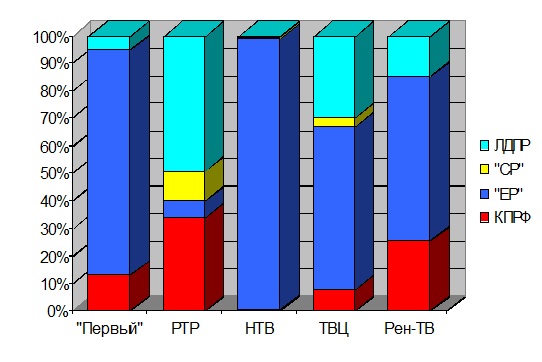 «Единой России» была предоставлена наибольшая доля телеэфира на НТВ и «Первом» канале (98 и 82%). На канале «Россия» Партия власти неожиданно получила всего лишь 6%. «Справедливая Россия» заняла максимум эфира телеканала «Россия» (11%). ЛДПР отдали предпочтение «Россия» и ТВЦ (49 и 30%).