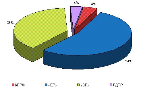 Что касается синхрона (прямой речи) партийцев, то его структура аналогична: единороссам было предоставлено 54% суммарного времени, либерал-демократам – 4%, справороссам – 38%. Коммунистам досталось 2 минуты 13 секунд, или 4%, что в 13 раз меньше чем представителям «ЕР» и в 9 раз меньше, чем «СР» (График 2).