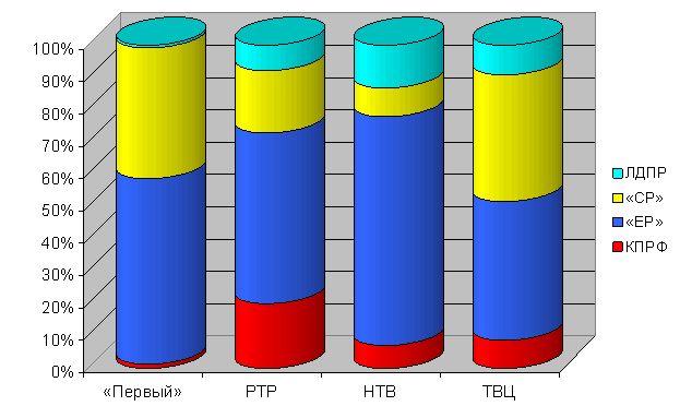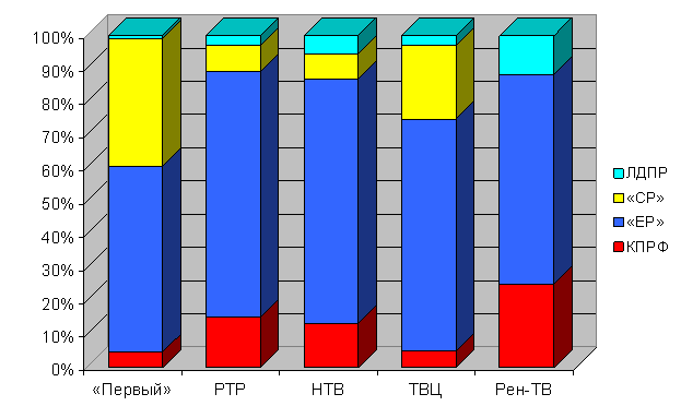 «Единой России» была предоставлена наибольшая доля телеэфира на «России» и НТВ (по 74%). Однако нигде эта величина не опускалась ниже 56%. «Справедливая Россия» заняла максимум эфира телеканалов «Первый» и ТВЦ (38 и 22%). ЛДПР отдал предпочтение Рен-ТВ (12%).
