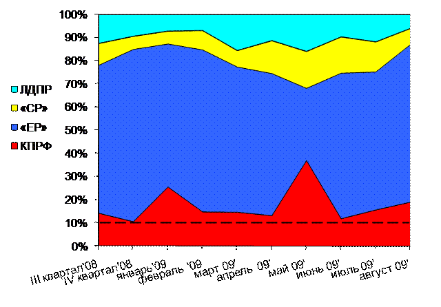 В течение мая 2008 г. – августа 2009 г. структура партийного телеэфира менялась следующим образом (График 3):