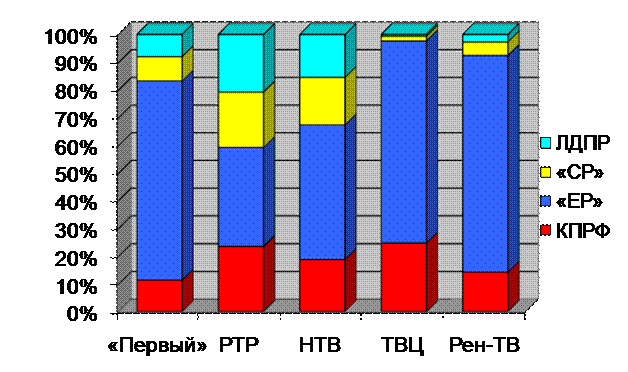 «Единой России» была предоставлена наибольшая доля телеэфира на Рен-ТВ и ТВЦ (78 и 73%). Однако нигде эта величина не опускалась ниже 36%. «Справедливая Россия» заняла максимум эфира телеканалов «Россия» и НТВ (20 и 17%). ЛДПР также отдали предпочтение «Россия» и НТВ (21 и 16%).