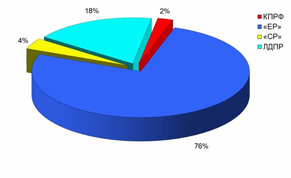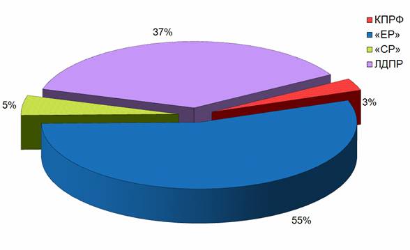 Что касается синхрона (прямой речи) партийцев, то его структура аналогична: единороссам было предоставлено 55% суммарного времени, либерал-демократам – 37%, справороссам – 5%. Коммунистам досталось 1 минута 12 секунд, или 3%, что в 19 раз меньше, чем представителям «ЕР», в 13 раз меньше, чем ЛДПР и в 2 раза меньше, чем «СР». (График 2).