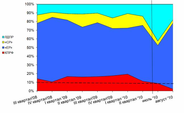 Динамика суммарного партийного эфира, июль 2008 г. – август 2010 г.