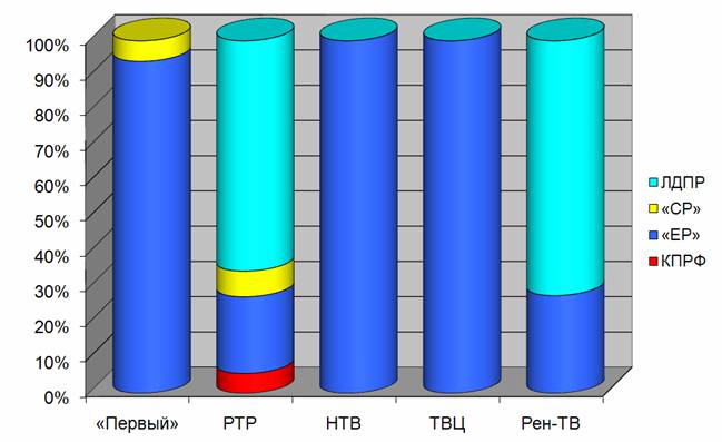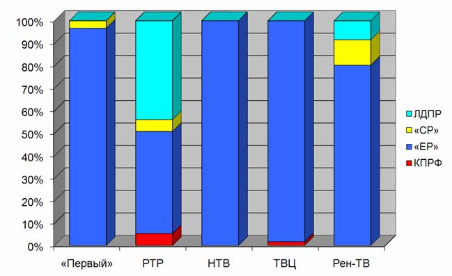 «Единой России» была предоставлена наибольшая доля телеэфира на НТВ и ТВЦ (100 и 98%). Однако нигде эта величина не опускалась ниже 45%. «Справедливая Россия» заняла максимум эфира телеканала Рен-ТВ (11%). ЛДПР отдал предпочтение канал «Россия» (44%).