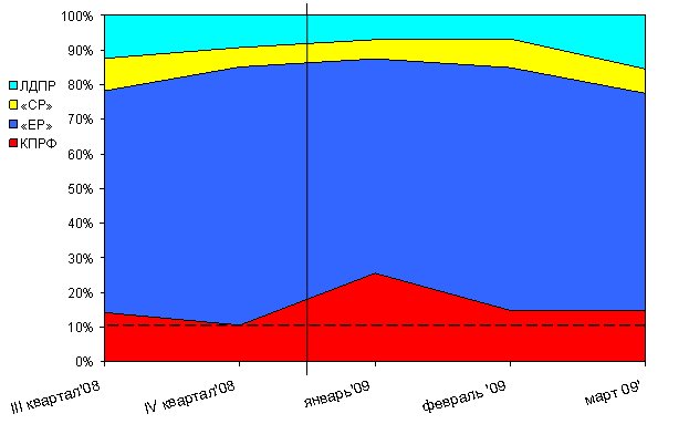 В течение июля 2008 г. – марта 2009 г. структура партийного телеэфира менялась следующим образом (График 3):