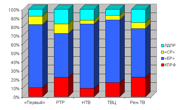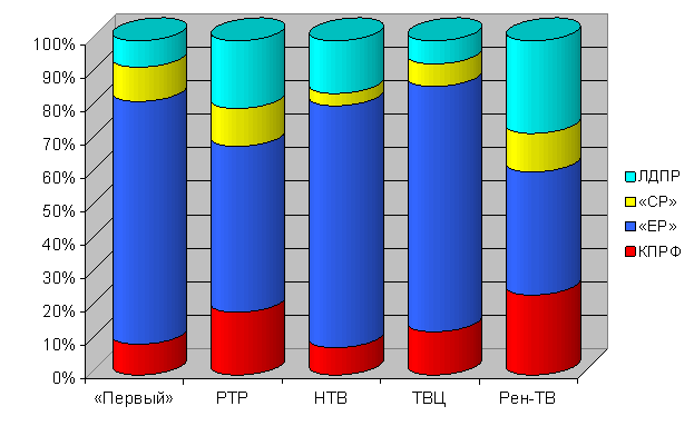 Достаточно любопытен тот факт, что «Единой России» была предоставлена наибольшая доля телеэфира на НТВ и «Первом» (74 и 73%), то есть на тех каналах, которые предоставили меньше всего времени КПРФ. Однако нигде эта величина не опускалась ниже 50%. «Справедливая Россия» заняла максимум эфира телеканала «Россия» (11%). ЛДПР отдали предпочтение «Россия» и Рен-ТВ (17 и 15%).
