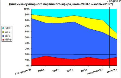 Таким образом, в июле 2013 г. доля КПРФ возросла с 9 до 15% по сравнению с июнем. Компартия переместилась с последнего по освещению места на предпоследнее. Доля ЛДПР резко возросла в связи с нападением на депутата Худякова.