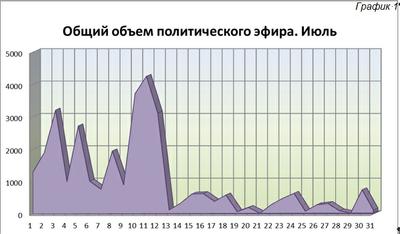 Объем политического телеэфира значительно различался по продолжительности в разные дни июля. Основные точки политической активности в телеэфире пришлись на 11-12, 3, 5 и 8 июля. Во второй половине месяца политическая активность резко упала.