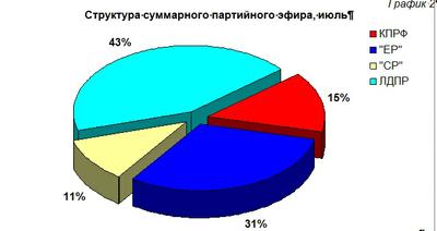 - Доля ЛДПР также возросла с 12% в июне до 43% в июле и превзошла долю «Единой России». Это было вызвано широким освещением дела депутата А. Худякова. Таким образом, не удивительно, что наибольшую долю либералы получили на канале НТВ (71%), который всегда наиболее подробно освещает криминальные происшествия.