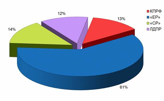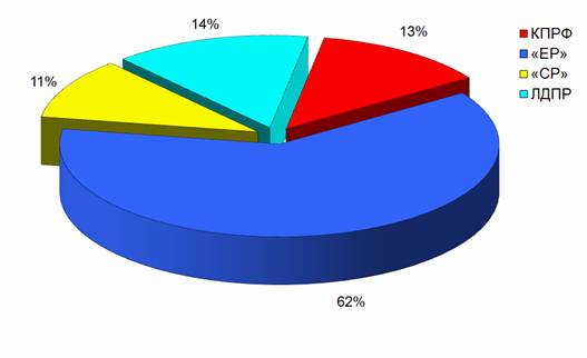 «Единая Россия» получила 4 часа 11 минут 41 секунду, что составило 62%. На долю ЛДПР пришлось 14% эфирного времени, на долю «Справедливой России» - 11%.