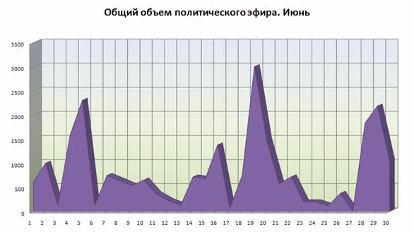 Основные точки политической активности в телеэфире пришлись на 19, 5 и 29 июня. 19 июня это было связано с выходом в эфир телепередачи, подводящей итоги политического сезона на телеканале «Россия», 5 июня обсуждалась ситуация на Северном Кавказе на канале ТВЦ. А 29 июня вышли сразу две телепередачи: «Честный понедельник» на НТВ о спиртных изделиях в России и «Момент истины» на ТВЦ.