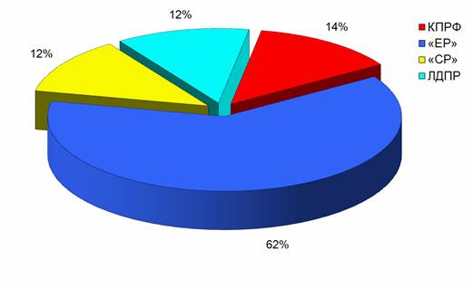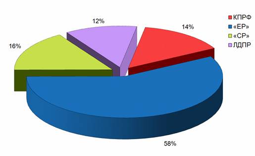 Что касается синхрона (прямой речи) партийцев, то его структура аналогична: единороссам было предоставлено 58% суммарного времени, либерал-демократам – 12%, справороссам – 16%. Коммунистам досталось 24 минуты 7 секунд, или 14%, что в 4 раза меньше чем представителям «ЕР» и на 1/8 меньше, чем «СР» (График 2).