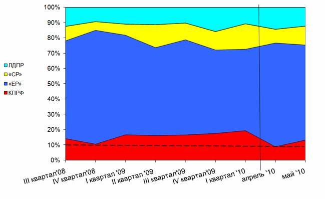 Таким образом, необходимо отметить, что хотя по сравнению с апрелем доля КПРФ и возросла, однако она по-прежнему не достигает уровня I квартала 2010 года.