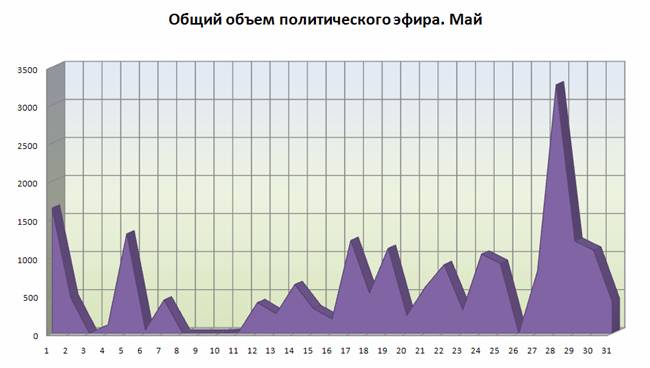 Основные точки политической активности в телеэфире пришлись на 28, 1 и 5 мая. 28 мая это было связано с освещением встречи Д. Медведева с активом партии «Единая Россия», 1 мая с освещением первомайских демонстраций и 5 мая с обсуждением Генплана Москвы. 9, 10 и 11 мая телеканалы предпочли не затрагивать политические темы вовсе.