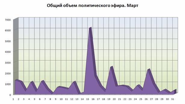 Основные точки политической активности в телеэфире пришлись на 15, 19 и 26 марта. 15 марта это было связано с подведением итогов выборов в России, 19 марта прошла он-лайн конференция Б. Грызлова. 26 марта телевиденьем обсуждались результаты параолимпиады и будущее отечественного спорта.
