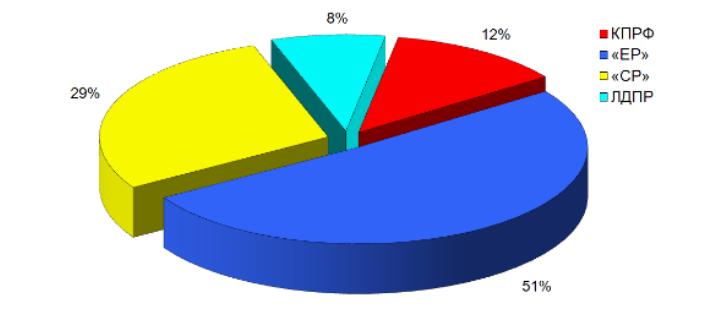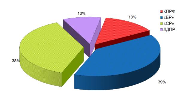 Что касается синхрона (прямой речи) партийцев, то его структура аналогична: единороссам было предоставлено 39% суммарного времени, либерал-демократам – 10%, справороссам – 38%. Коммунистам досталось 23 минуты 32 секунды, или 13%, что в 4 раза меньше, чем представителям «ЕР» и в 3 раза меньше, чем «справедливороссам» (График 3).