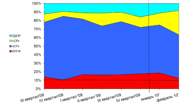 Таким образом, в февраля доля КПРФ вновь падает. Однако существенно возрастает доля «Справедливой России», что было связано с «конфликтом» между С. Мироновым и «Единой Россией».