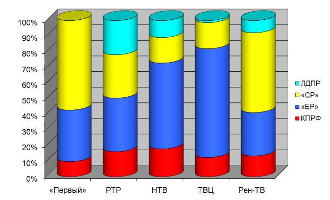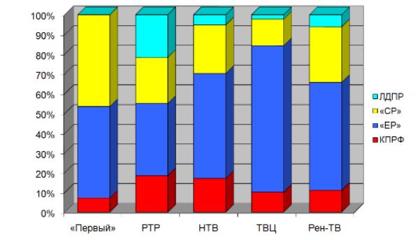 «Единой России» была предоставлена наибольшая доля телеэфира на ТВЦ и Рен-ТВ (74 и 55%). Однако нигде эта величина не опускалась ниже 37%. «Справедливая Россия» заняла максимум эфира «Первого» телеканала (46%). ЛДПР отдал предпочтение канал «Россия» (22%).