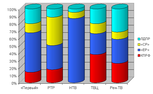 «Единой России» была предоставлена наибольшая доля телеэфира на НТВ и Рен-ТВ (56 и 48%). Однако нигде эта величина не опускалась ниже 21%. «Справедливая Россия» заняла максимум эфира телеканала «Россия» (33%). ЛДПР отдал предпочтение «Первый» канал (24%).