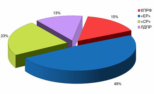 Что касается синхрона (прямой речи) партийцев, то его структура аналогична: единороссам было предоставлено 49% суммарного времени, либерал-демократам – 13%, справороссам – 23%. Коммунистам досталось 1 час 8 минут 26 секунд, или 15%, что в 3 раза меньше чем представителям «ЕР» и в полтора раза меньше, чем «Справедливороссам» (График 2).